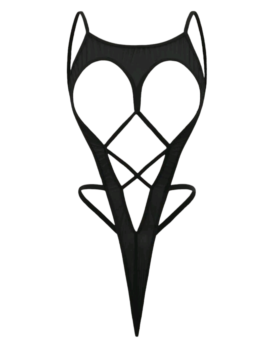 Czarne erotyczne body otwarte na biuście, dół stringi.