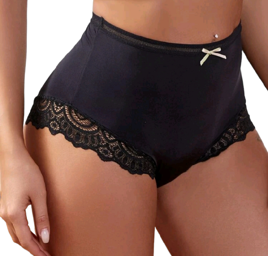 Zmysłowe figi koronkowe kryjące, wysoki stan. Model elastyczny z dużą rozciągliwością, zdobiony koronką.
